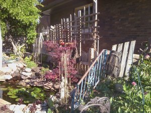 Last year, I used most of the rest of the pickets to create an old, arbor-like, shabby-chic backdrop for my pond (see picture, right). Looks like its been there a hundred years, but it’s perfect, for now, to support the cardinal vine that will hug it, twist and turn through it; and when in bloom, beckon the hummingbirds…